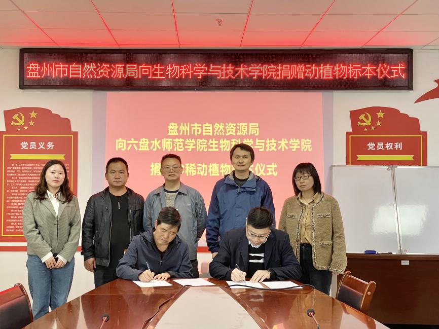 捐赠仪式在奥学楼A623会议室举行。熊荣川向盘州市自然资源局和六盘水市林业局自然保护地中心表示感谢,并与盘州市自然资源局林业执法队队长郭应签署移交文件。张书东详细介绍学院获批全国科普教育基地的相关情况和动植物标本馆发展规划,表示受捐的珍稀动植物标本将全部用于学院师生教学科研和科普工作使用,发挥最大效益。