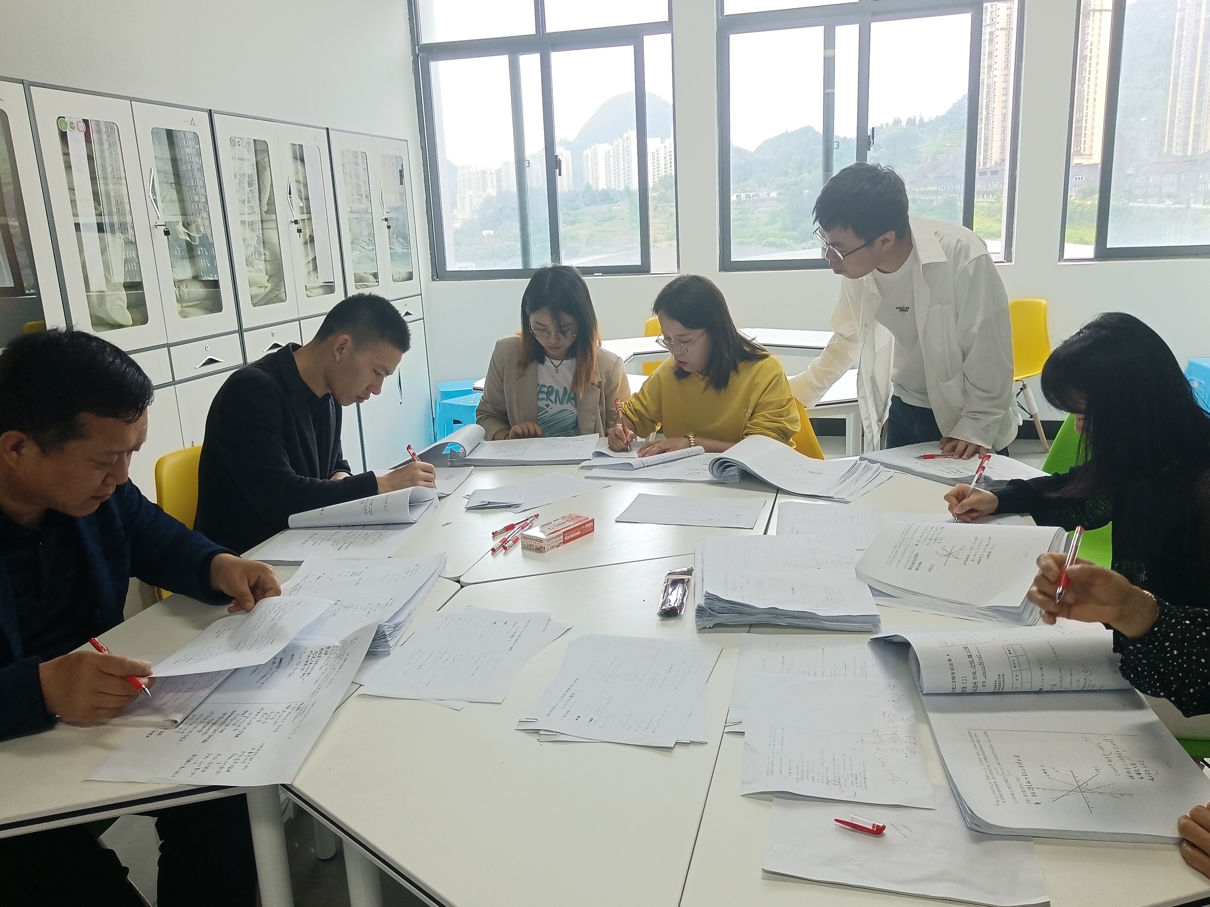 6月19日上午,高等数学教学部在奥学楼办公室集中批改2021级预科数学试卷。根据六盘水royal皇家88平台2021—2022 学年第二学期普通本科学生转专业及大类招生专业分流相关工作要求,预科班数学期末考试于6月18日结束。2021级预科有9个班级共450余人,考虑到试卷批改难度较大,批阅时间较紧,为了不影响学生专业分流,高等数学部召集全部高等数学老师对预科数学进行批阅,并要求及时准确将成绩录入教务系统。学院领导非常重视对预科数学试卷的评阅工作,并提出了以下要求: