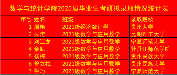 我院2025届毕业生有26名同学参加考研,7名同学上线,7名同学已全部拟录取。拟录取为贵州大学、昆明理工大学等学校的硕士研究生。上线率26.92%,上线录取率为100%,彰显了我院在专业建设、教学管理以及学生培养等方面所取得的显著成绩。