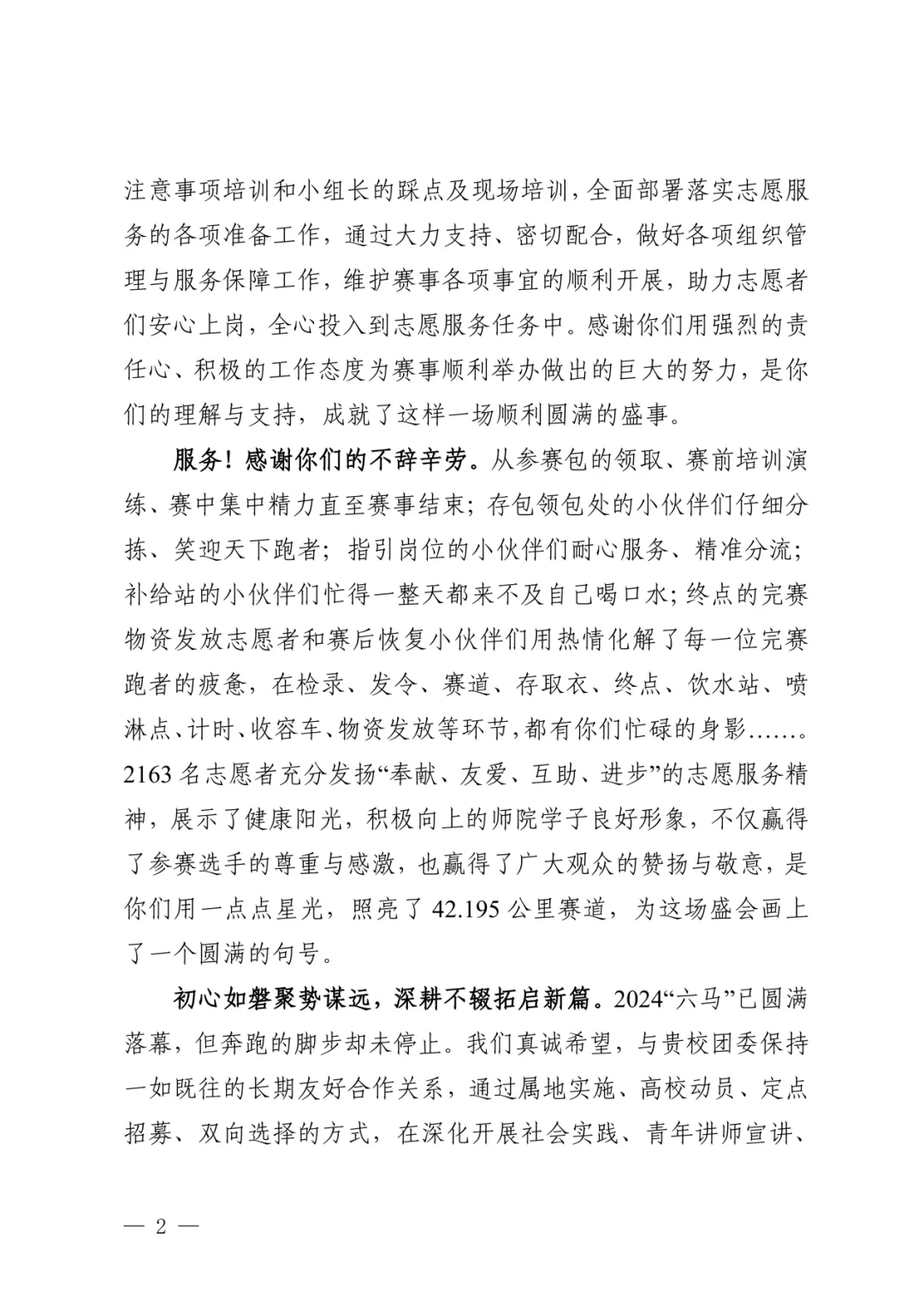 在2024六盘水马拉松中,学校团委4月便开始了前期的筹备工作,我校2190名师生为32000余名选手提供了暖心周到的服务,在此,对参与此次志愿服务的师生致以崇高的敬意。今后,我校将继续弘扬“奉献、友爱、互助、进步”志愿服务精神,通过六盘水马拉松赛志愿服务等载体,助力我校团员青年青春出彩,服务地方经济社会发展,实现与“六马”的双向奔赴。
